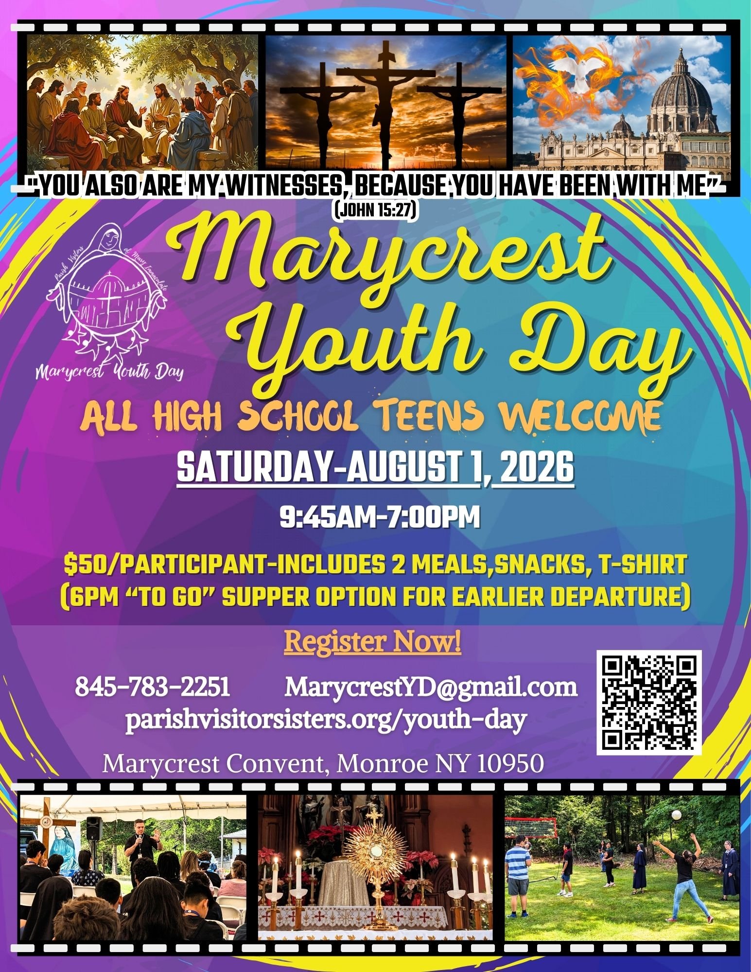 The cost of “Marycrest Youth Day 2026″ is $50.00 per participant (youth or adult). All fees are non-refundable. Included in the fee: two meals (lunch and dinner), snacks, T-shirt, religious articles, and the conference.